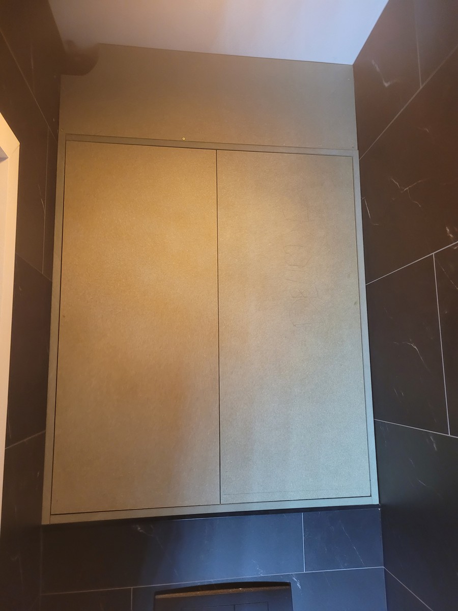 We hebben een op maat gemaakte kast ontworpen en gerealiseerd voor de droogkast en wasmachine. De kast is voorzien van ventilatieopeningen bovenaan de deurtjes en ruimte voor stekkers en afvoeraansluitingen. Voor extra duurzaamheid is gekozen voor groene MDF, die vochtbestendig is.